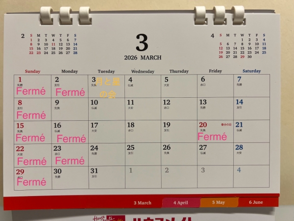 今月のカレンダー 2026-03-02 06:44:46 22026 3月の営業日です。2026年 3月のカレンダーです。今月も美味しい料理とワインご用意してお待ちいたしてます。 この季節の前菜は ホワイトアスパラガス。マルテーズソースを添えて。アルザスのミュスカワインとのマリアージュでお待ちいたしてます。